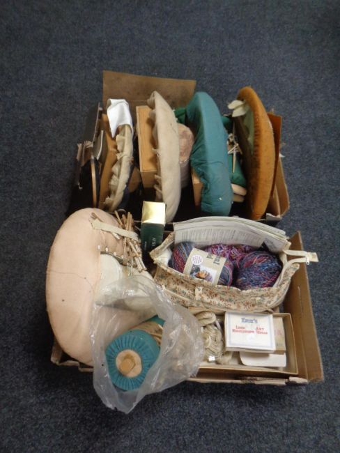 Two boxes containing a large quantity of lace making equipment, wool, haberdashery items.
