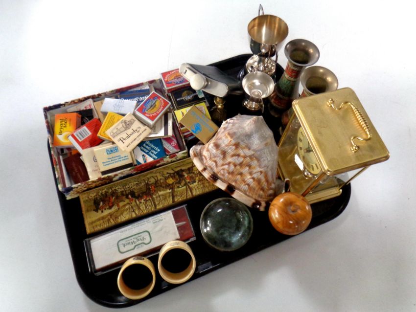 A tray containing miscellaneous to include match books, anniversary clock, plated trophies, shell hip flask etc