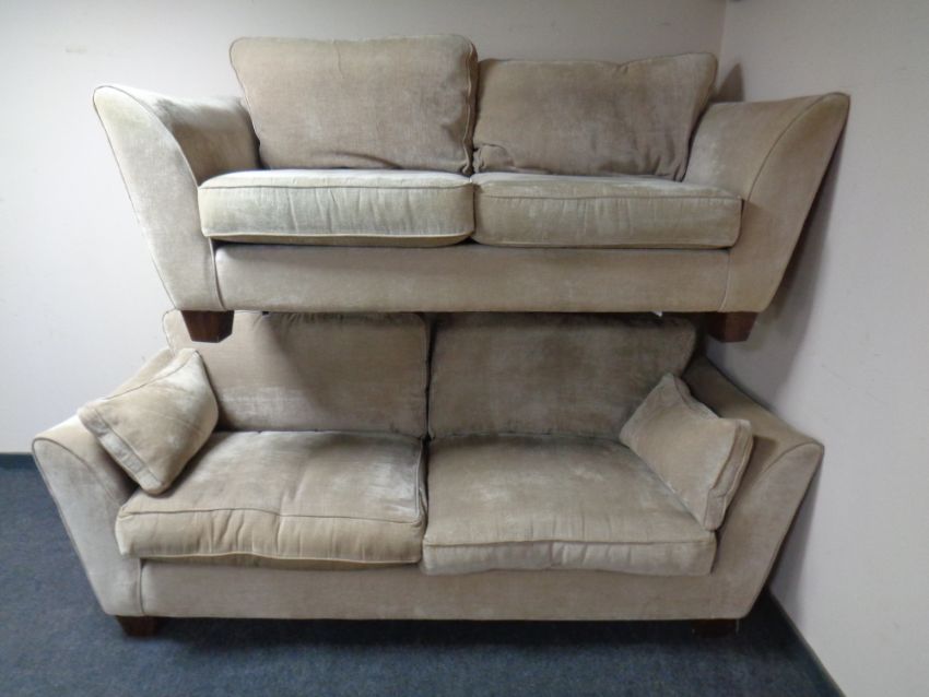 A contemporary three seater settee with matching two seater settee upholstered in a beige fabric
