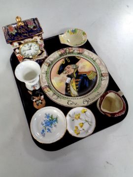 A tray containing assorted ceramics to include Royal Doulton The Admiral plate, Royal Doulton Drake character jug, Masons Mandalay mantel clock, Royal Doulton Bunnykins figure, School Master etc