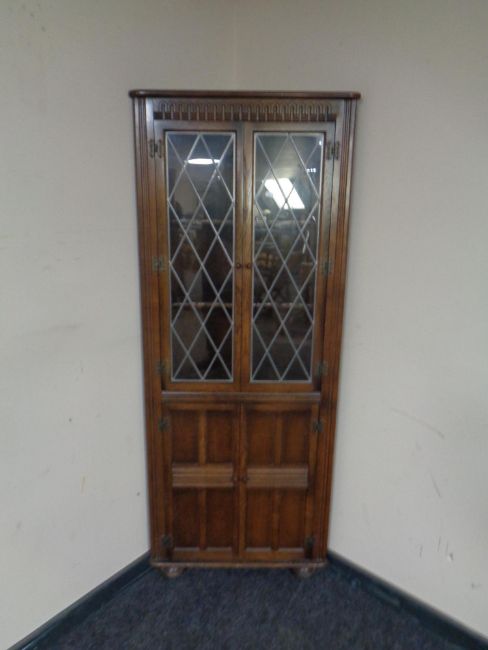 An Ercol elm and beech corner display cabinet with leaded glass doors in an oak finish