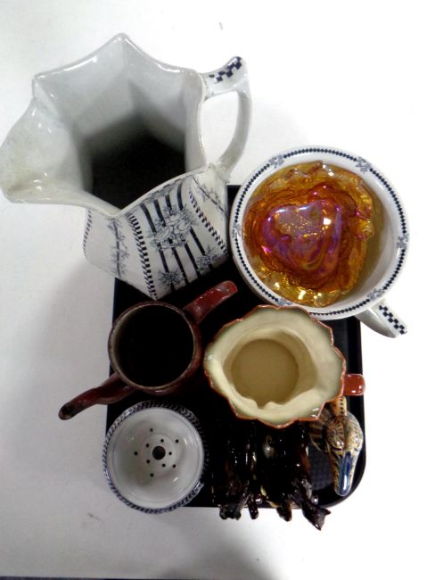 A tray of Corona ware wash jug, soap dish and chamber pot, Royal Doulton character jug Old King Cole, carnival glass dish etc
