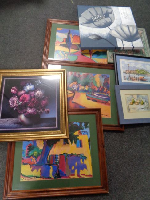 Six contemporary framed prints together with a wall canvas and a framed needlework panel