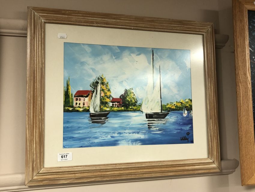 20th century school : Sailing boats on calm water, oil on board, 39 x 29 cm, indistinctly signed, framed