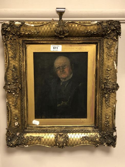 19th century school : Portrait of a gentleman wearing spectacles, oil on canvas, 19 x 24 cm, gallery label verso inscribed by Alice Laybourne