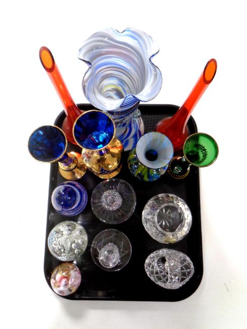 A tray containing assorted glassware to include glass paperweights to include Mdina, cut glass candlesticks, Bohemian glass vases etc