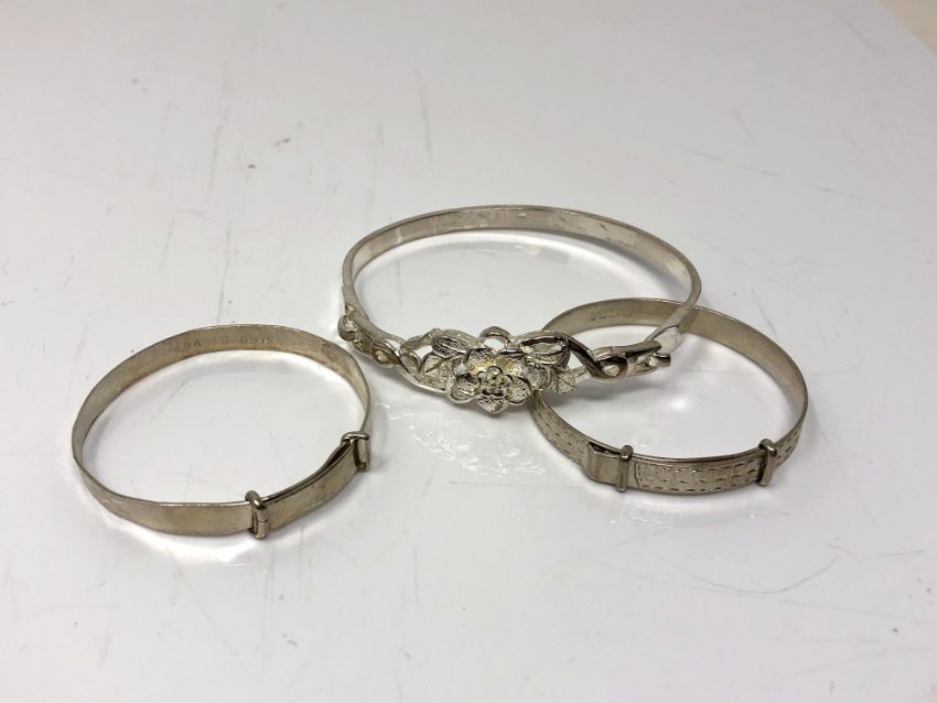 A silver expanding cuff bracelet together with two others indistinctly marked.