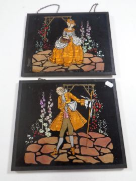 A pair of vintage foil pictures on glass, lady and gentleman