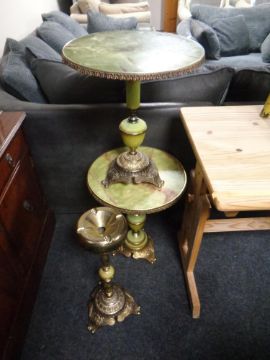 A pair of gilt and onyx effect wine tables together with a matching smoker's stand