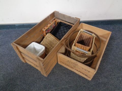 Two 20th century pine crates together with a small quantity of wicker baskets, various sizes