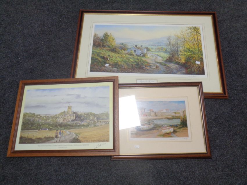 A Rex Preston signed print, Autumn in the Dales, together with two further signed prints, Cullercoats Harbour by Lindsay and Durham City by Charles Evans
