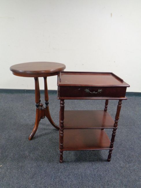 A Victorian style pedestal occasional table together with a three tier stand, fitted a drawer