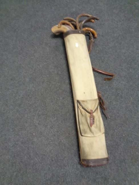 A box of vintage badminton and tennis rackets, canvas golf bag containing walking sticks and hockey sticks