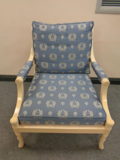 A wood framed armchair upholstered in a classical blue and gold fabric