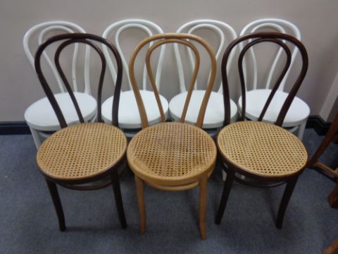A set of four plastic Ikea Bentwood chairs together with three further wooden Bentwood chairs