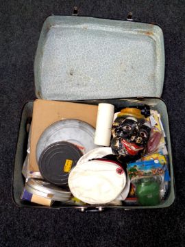 A twentieth century luggage case containing film reels, splicer, toys, paper ephemera etc
