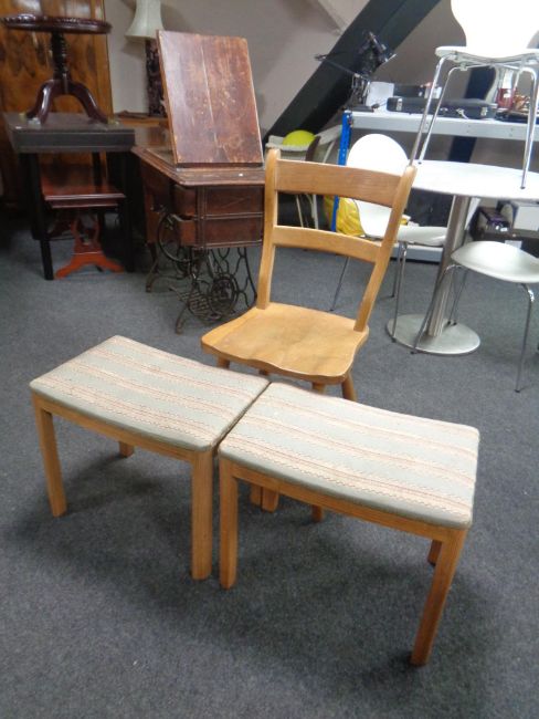 An oak kitchen chair together with two upholstered dressing table stools