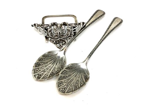 A pair of Victorian silver jam spoons and an ornate silver menu stand (3)