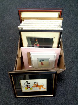 A box containing 14 assorted framed prints to include Edward Ladell, Joseph Farquhrxon, Disney and Campri advertisement etc