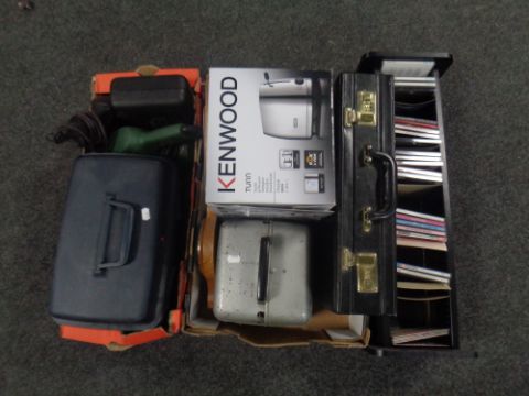 Two boxes containing vintage projector, power tools, boxed Kenwood toaster, briefcase, together with a CD rack containing CDs