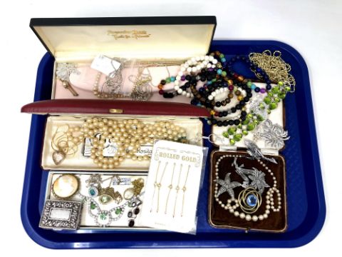A tray containing costume jewellery, silver chains, marcasite items, beaded necklaces, pearls etc