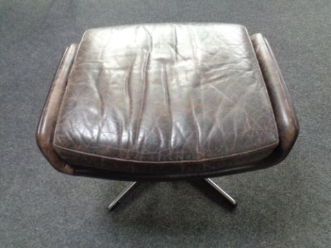 A 1970s continental brown leather footstool on a chrome pedestal