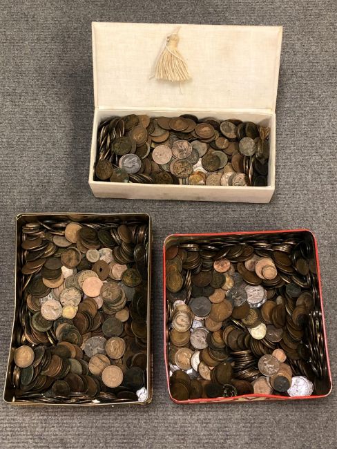 Two tins and a box of Charles II and later bronze and copper coins, Georgian and Victorian examples, many good farthings