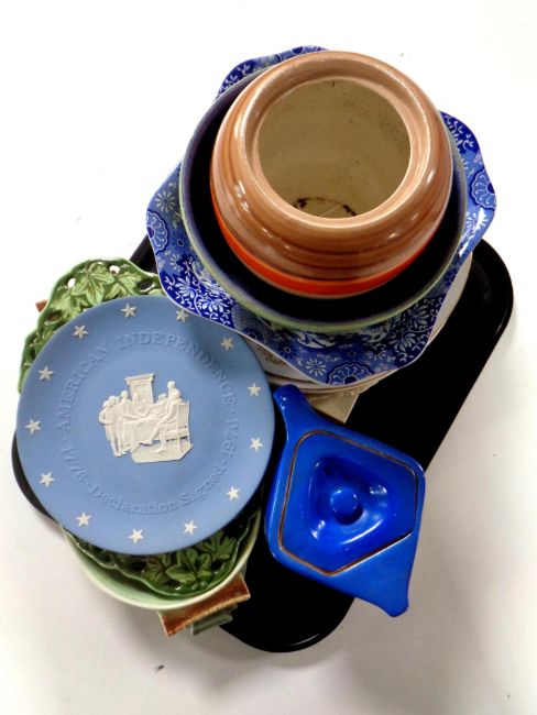 A tray of antique and later ceramics to include wall plates, Wedgwood plate, Spode Italian bowl, crackle glazed lamp base etc