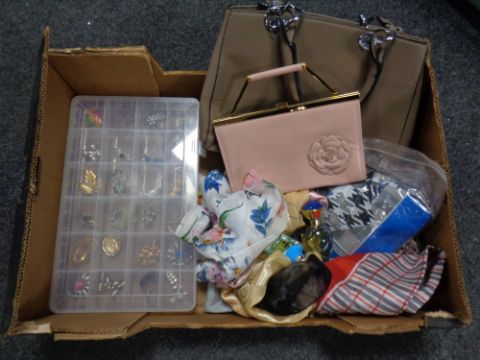 A box containing lady's handbags, scarves, perfumes, together with a plastic display box containing costume brooches