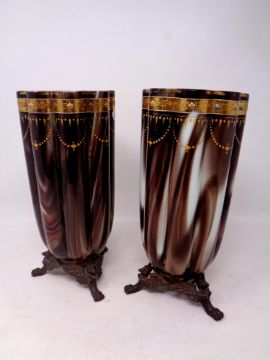 A pair of 19th century hand painted brown glass vases on metal griffin feet, height 25 cm