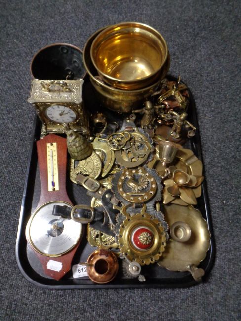 A tray containing a large quantity of antique and later metal wares to include copper and brass planters, horse brasses, a crown money box etc