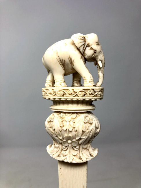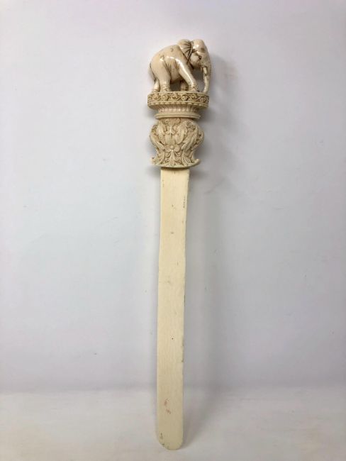 A large 19th century Indian ivory page turner with carved terminal elephant figure on stepped plinth, length 38.5 cm.