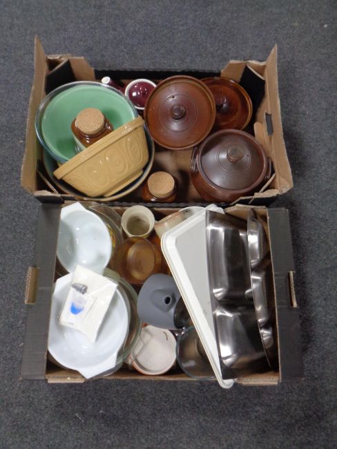 Two boxes containing antique and later kitchen ware to include stoneware pots, mixing bowls, stainless steel dishes etc