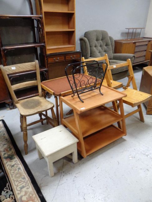 An antique kitchen chair together with two further folding kitchen chairs, a three tier trolley, folding card table, a painted storage stool and a wire metal magazine rack