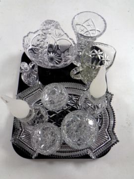 A tray of 20th century cut glass including dressing table tray, lidded pots, pair of candlesticks, basket etc