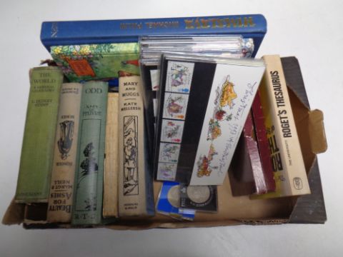 A box containing 20th century hardback books, Thesaurus, Rupert the Bear annual, together with a small quantity of first day covers