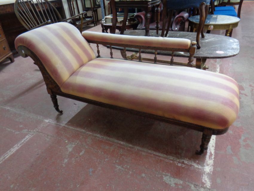 An Edwardian oak framed chaise longue upholstered in a striped fabric with two matching cushions