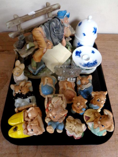 A tray containing miscellaneous to include Pendelfin ornaments, Capodimonte figure of a tramp on bench, china dishes etc