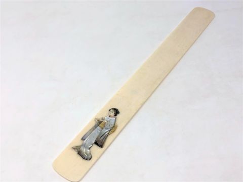 A late 19th century Japanese ivory page turner, the double sided decoration with foliage and Geisha figure, length 30.5 cm.