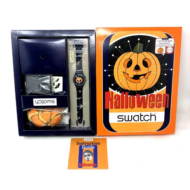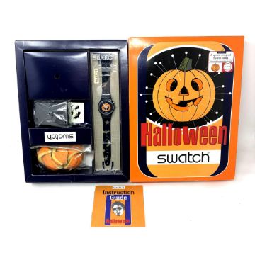 A Swatch Halloween Pumpkin watch in box.