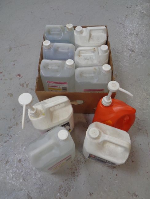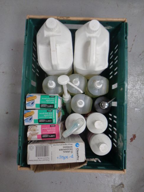 Two boxes containing a quantity of commercial cleaning equipment to include floor gel, dishwasher detergent etc