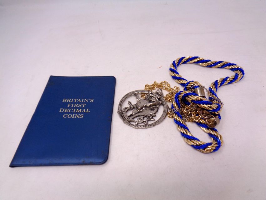 A Decimal coin set in wallet together with costume necklace, large pendant etc.