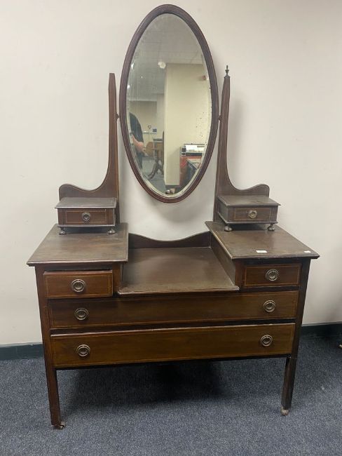 A late Victorian inlaid mahogany sunk centre dressing table with mirror back