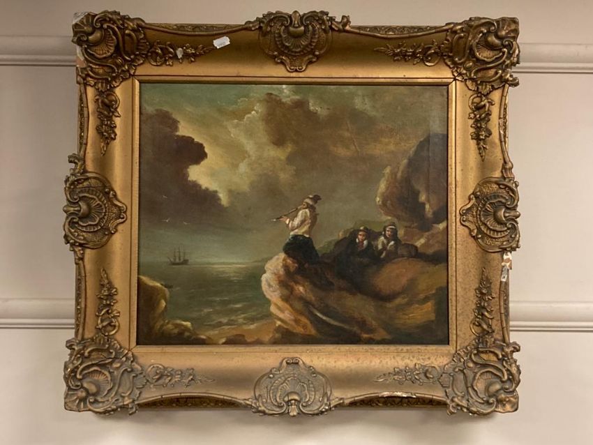 Nineteenth century school : The look out, figures on a rock, oil on canvas, 47 cm x 40 cm, framed.