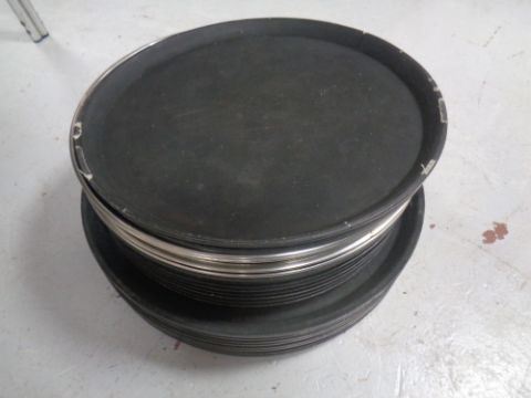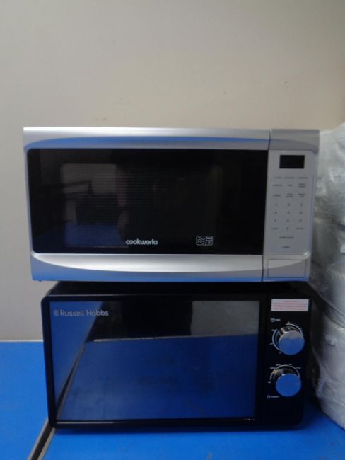 A Cookworks microwave together with a Russell Hobbs microwave and a quantity of pub trays