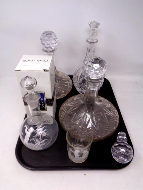 A tray containing antique and later decanters to include boxed RCR decanter, ship's decanter, a hand painted 19th century liqueur decanter with matching glass