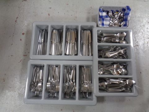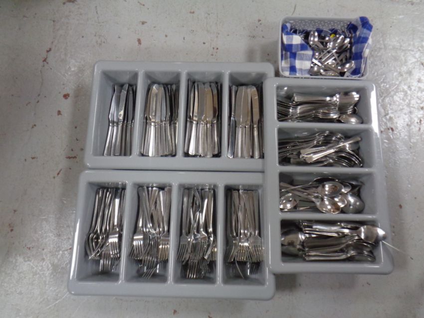 Three cutlery trays and a basket containing a large quantity of stainless steel catering cutlery