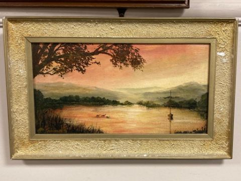 Twentieth century school : Sunset across a lake, oil on board, 36 cm x 19 cm, indistinctly signed, together with the companion piece, both parts framed. (2)