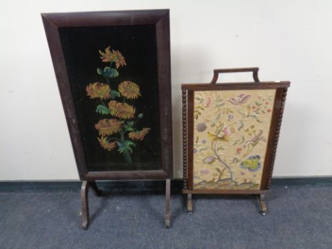 An early 20th century beech tapestry fire screen together with a further fire screen with a hand painted panel on fabric