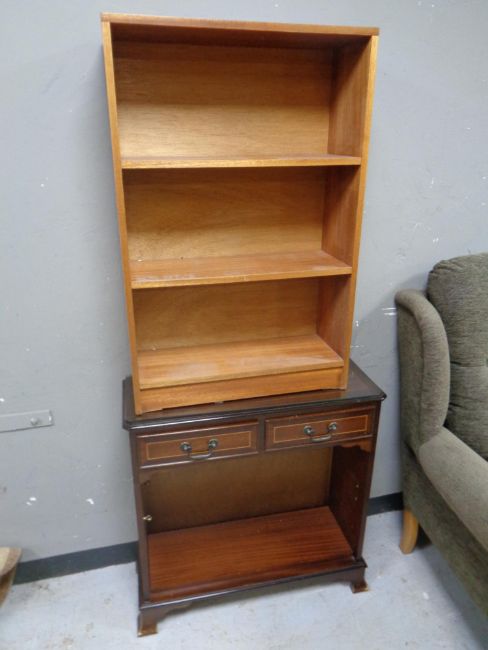 A set of 20th century teak open bookshelves together with a set of inlaid mahogany bookshelves fitted two drawers